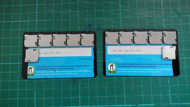 Lugar que la SD zócalos por lo que se colocan uniformemente a través de la tarjeta, colocar las dos exteriores zócalos de primera, 2mm desde el borde y tocar los 3 mm tira de vinilo (no en la parte superior del vinilo). Luego coloque los 3 zócalos internos y asegúrese que estén en línea. Asegúrese de que no se superpongan entre sí.
