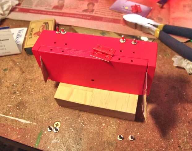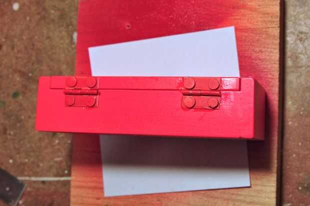 Después de aplicar la capa superior al titular de la tarjeta y la tapa, es tiempo para el montaje de las bisagras. Usé dos pequeñas bisagras que conseguí en una tienda de suministros de Artes.