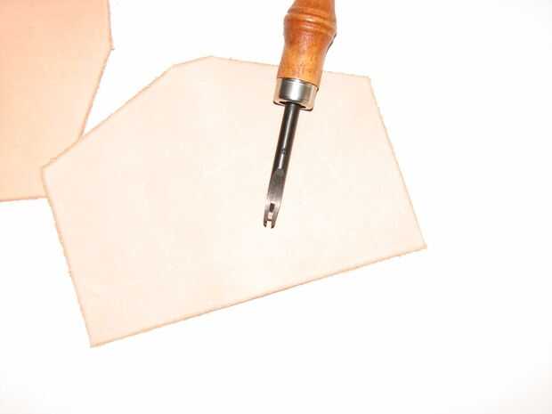 Trace el patrón en la parte posterior de su cuero (yo usé 2 oz veg tan) corta el cuero. Necesitas dos piezas de cuero. Usando divisores de ajuste 3/16 de pulgada, marca a lo largo de los lados y el borde inferior de cada pieza de cuero. Esto se utiliza como una guía cuando usted perfora los agujeros para coser todo junto. Ahora, utilizando una herramienta de bordes, recorte los bordes todo el camino alrededor de la piel. Si vas a teñir el titular de la tarjeta, ahora es el momento para hacerlo.