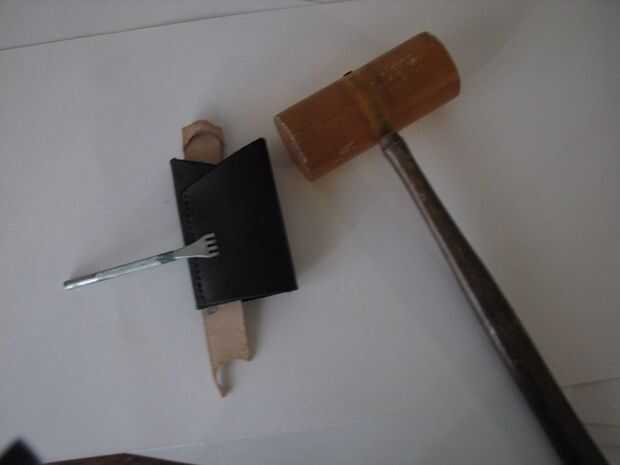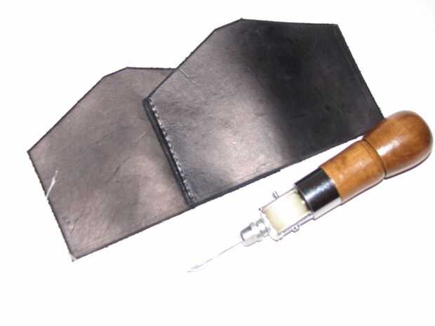 Ahora que el tinte es seco es hora de poner juntos. Aplique una capa delgada de cemento de contacto 1/8 pulgada de ancho en el borde exterior de la pieza superior y la zona correspondiente en la pieza inferior (ver notas en las fotos). Cuando el pegamento esté seco, utilizando la línea hecho antes con el divisor como guía, tomar el punzón y martillo y perforar los orificios necesarios para coser al titular de la tarjeta. una vez terminada la primera parte, dan la vuelta y pegamento, agujeros y coser juntos. Usé una lezna de costura para coser esto juntos. Si usted nunca ha usado uno, hay un gran tutorial en la Página Web de cuero de Tandy. http://www.tandyleather.com/en/Using-the-Sewing-AW... Cuando haya terminado con los lados es tiempo para formar el titular de la tarjeta. Yo sé, el fondo está todavía abierto, será más fácil coser juntos después de la formación. Sumergir el titular de la tarjeta en un recipiente de agua durante unos pocos segundos. Con los dedos, asegúrese de que el titular es cuadrado luego aplanar. I utiliza algún desecho de cuero para proteger el soporte y fijar juntos y deje que se seque. Cuando esté seco puedes perforar los agujeros y coser la parte inferior. Cuando termine de coser solo sellarlo hasta con brillo de la piel y estás listo para ir.