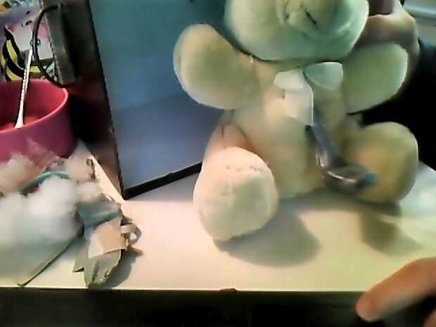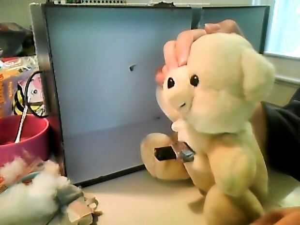 Poner primero el mecanismo dentro de la memoria animal relleno, por lo que el titular está justo detrás del agujero, ahora cuando empuje la cabeza hacia atrás la cabeza del peluche el pendrive vendrá adelante. LISTO!