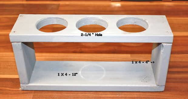 Cortar la madera (ajuste de dimensión para satisfacer sus necesidades). Para la medida de la pieza superior y corte tres Sierra de 2-1/4" agujeros usando una plantilla. (Otra vez se puede ajustar para adaptarse a sus necesidades. Encolar y atornillar la madera como se muestra en la imagen. He utilizado botellas de cerveza de aluminio y cortar la parte superior con una sierra de mano a la altura deseada que necesitaba. Una vez más puede utilizar cualquier tipo de contenedor y ajustar la altura y el diámetro para satisfacer sus necesidades. Liso de la parte superior con papel de lija. Como la pieza de fondo de 1 x 4 sin agujeros, celebrará los contenedores sin caer a través. Coloque su recipiente en los agujeros, poner en sus ataduras de cremallera o lo que desea almacenar y estás acabado. Un poco de pintura para rematar Si elegiste y tienes una gran manera de guardar esos molestos zip poco tirantes. Espero que esto funcione para usted. Revisa mis otras presentaciones. Gracias por mirar.