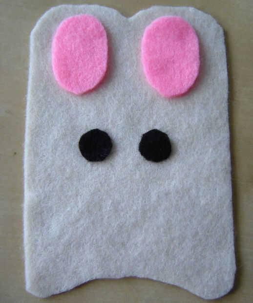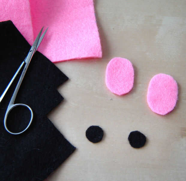 • Para las características de la cara, cortar dos formas ovaladas en color rosa para las orejas y dos pequeños círculos de color negro para los ojos. (También he añadido dos pequeños círculos blancos a la vista).