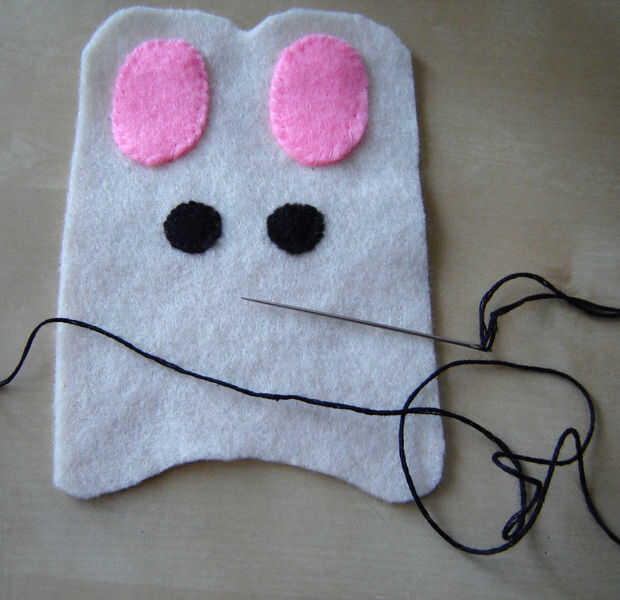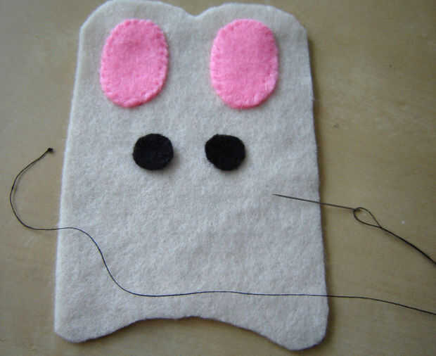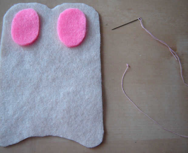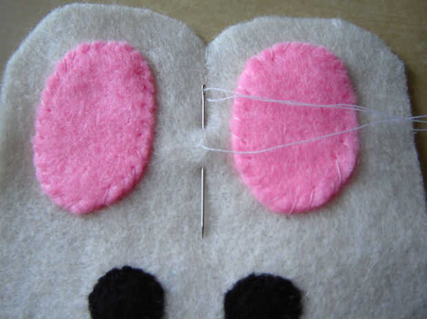 • Con un hilo blanco usé una puntada corriente para formar un pliegue entre las orejas.