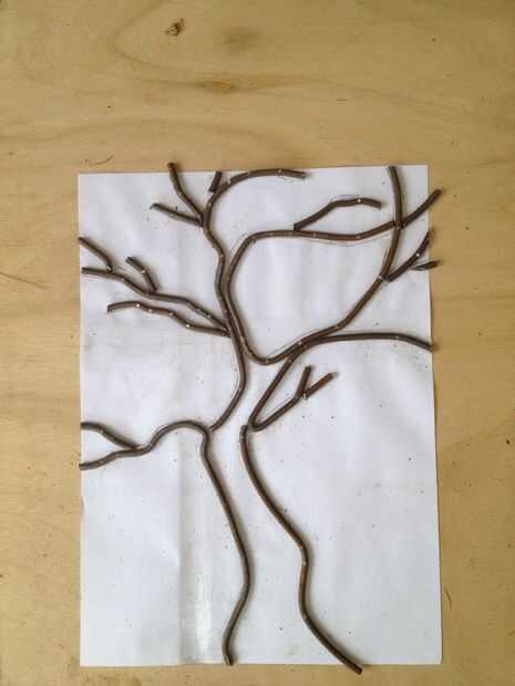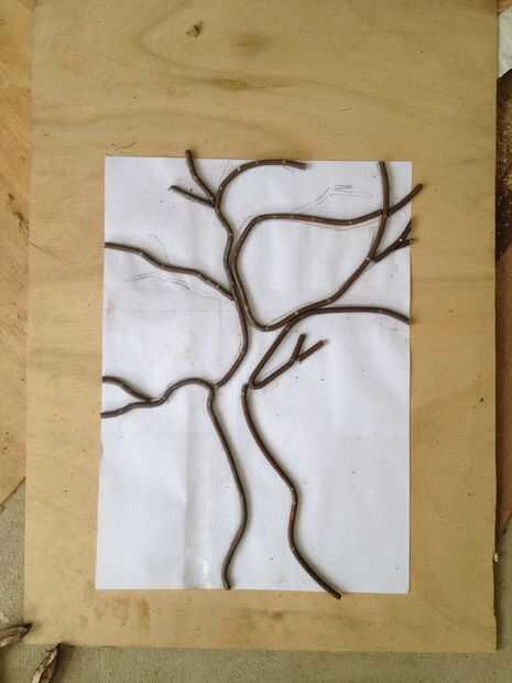 Para doblar la barra redonda poner una pequeña marca con un rotulador blanco y fui a la vice y tirar/empujar la barra redonda en la dirección que necesitaba. Seguir haciendo eso y después de algún tiempo tiene un árbol.