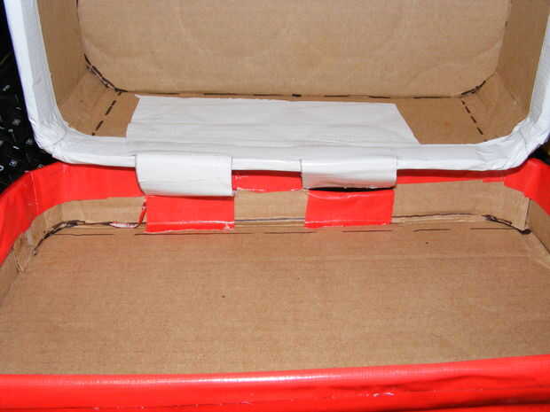 Para las bisagras, la tapa en la parte inferior será con la lonchera está parado en el borde, corte dos ranuras el ancho de la cinta.