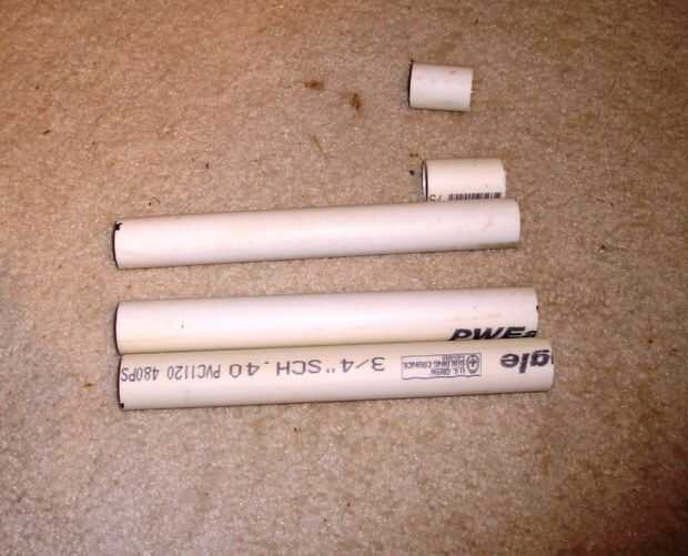 tenía un extra bloque y ladrillo de la pared así que monté un apoyo para obtener la longitud correcta para el PVC.  Terminé de cortar tres pedazos de la longitud del ladrillo.  y dos piezas de aproximadamente 2 pulgadas de largo.