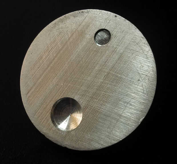 Taladro el imán 1/2" del borde. El agujero para el imán sólo debe ser 1/8" profundidad, usando una 1/2" broca. Prueba colocar el imán. Si el orificio está flojo, puede utilizar pegamento/epoxy para garantizar el imán en su lugar. Si el agujero es demasiado pequeño, taladro, dremel, mano archivo hasta que el imán quede firmemente.