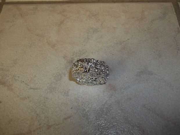 En primer lugar, hacer una base de papel de aluminio. Es posible utilizar arcilla polimérica para servir como la base pero no quería desperdiciar arcilla. Crear la base simplemente de la guata encima de tu hoja en forma de bola. No presione demasiado fuerte. Desea que la bola sea aproximadamente 1.25" a través de. Luego presione la bola en dos lados para crear un disco aplanado. El disco debe ser aproximadamente 1/2" de espesor. Hágale un agujero en el centro del disco. Puede utilizar el extremo de su hilo para ello pero utilicé un palillo de dientes.