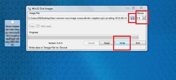 Una vez finalizada la descarga, Descargar programa Win32 Disk Imager al ordenador. Este programa de instalación. Al ejecutarlo. Seleccione Archivo de configuración de Tizen 1,4 GB y elegir que tu lector de tarjeta SD tarjeta SD y haga clic en escriben cargar archivos de configuración a la tarjeta micro del SD (consulte el cuadro)