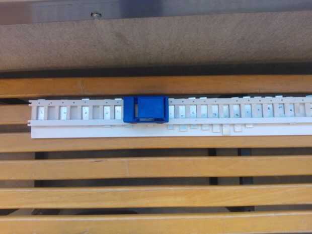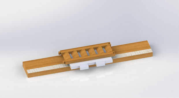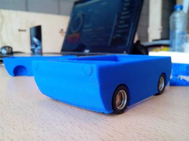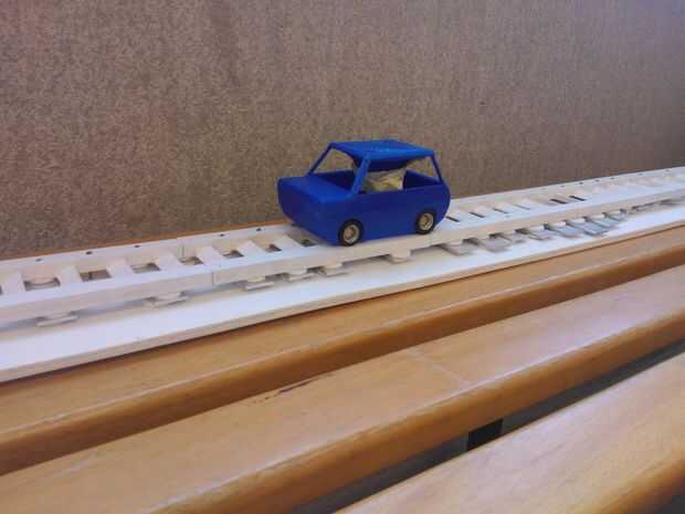 Utilizamos la herramienta de corte controlado por ordenador para las pistas. El coche fue impreso con una impresora 3D. Dentro del coche, hay un pequeño martillo que golpea en las barras del xilófono. entre las barras, las pistas y el zócalo, hemos puesto trocitos de tela para que las barras pueden temblar. Para las barras, se utilizó un xilófono real como referencia para la medida correcta para cada nota. Las barras y las pistas son asimiento en lugar de clavos, pero lo hicimos para que usted todavía pueda cambiar las barras para hacer una canción diferente. Las pistas pueden ampliarse.