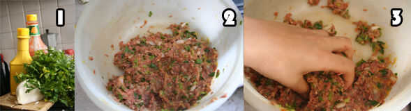 2. Añadir la cebolla picada, el perejil, sal, pimienta, salsa de tomate y mostaza (y si tienes tocino). Se desmoronan en la carne molida y mezcle con la mano. Ensuciarse. Formar 6 hamburguesas.