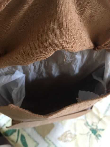 La bolsa hasta el agujero vacío del bolso del emparedado, pegamento abajo. Haga un patrón para el frente y también cubierta en la tela marrón. Dóblela para que se pegará con la bolsa de plástico. Hacer un colgajo para cubrir el interior. Casi listo!