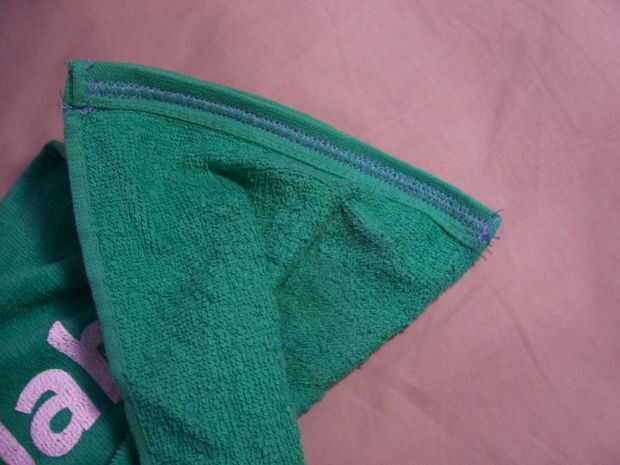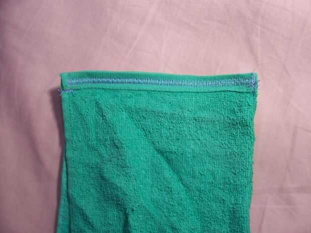 En este paso será coser el extremo sujetado juntos. Usé una puntada de cruz que es muy resistente y durará más que la voluntad de la toalla. (Utiliza la luz azul hilo... lo sentimos, podría ser un poco difícil de ver.)