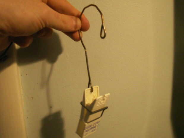 Así que hice unos ganchos de un colgador de ropa. Hay bastante sencillo cortar una percha en un par de piezas de 6 pulgadas de largo.
