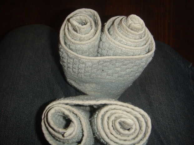 echar un vistazo a esta vieja toalla de té que tengo aquí, se ve como un pollo puede estar escondido ahí? Creo que veo una.Paso 1: primer Rollo a un lado de la toalla a mitad de camino.Paso 2: luego Rodillo hasta el otro lado.Paso 3: Y entonces Su to