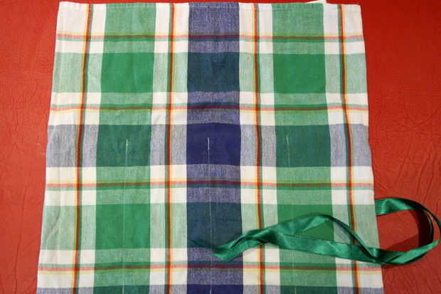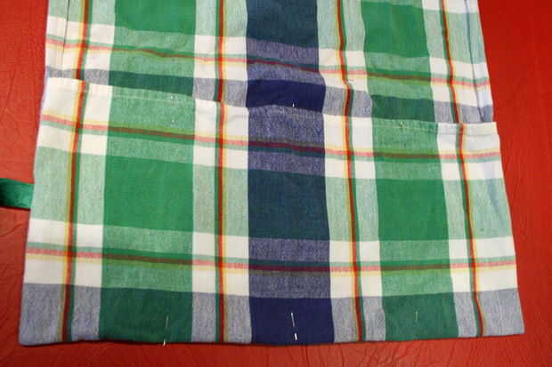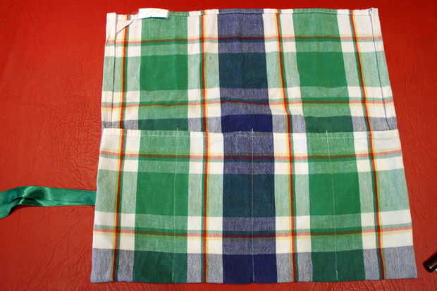 A continuación, dividir el bolsillo grande en segmentos más pequeños que tendrá cada tipo de cubiertos. Necesito cuatro bolsillos por lo que he reducido a la mitad y en cuartos y señaló que cada sección comienza y termina con los pernos. Puntada recta a lo largo de estas líneas. Y eso es toda la costura realizada.