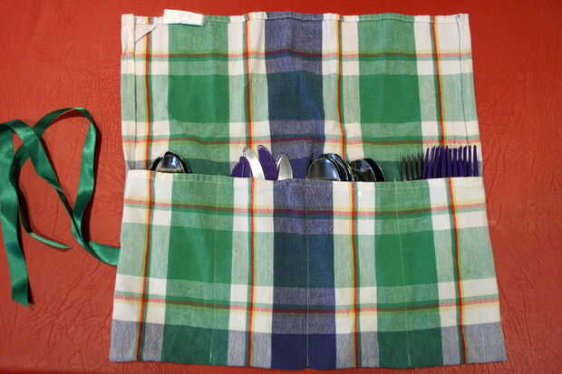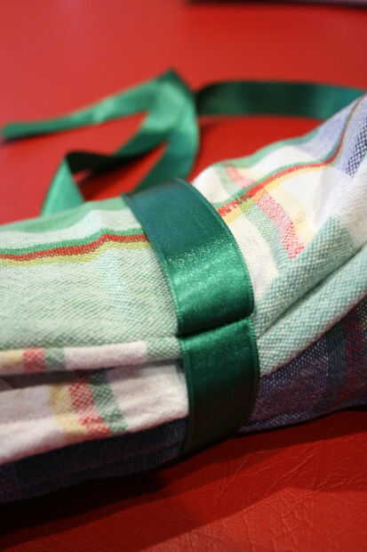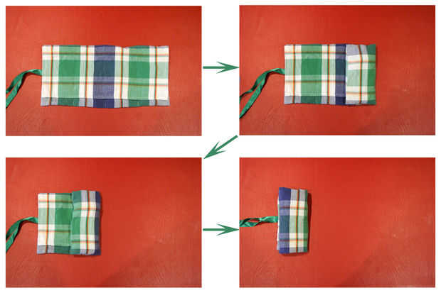 Ahora rodar la sección más lejana de la cinta hacia el interior por lo que es del el segmento siguiente. Doblar todo otra vez y otra vez acabado el rollo. Utilice la cinta para atar el paquete todo junto.