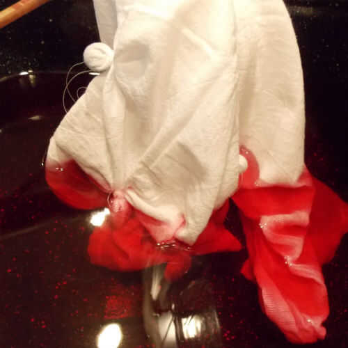 Llena tu olla con agua caliente, luego añadir aproximadamente 1/2 taza de sal. Remover para disolver. Con cuidado, agregar el colorante al agua. El tinte más, más profundo el color. Usé 1/2 de la botella para obtener un fucsia fuerte, agradable.