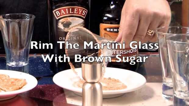 Extender dos cucharadas de azúcar morena en un plato y tun el borde húmedo del vidrio por el azúcar para darle un borde yummy!