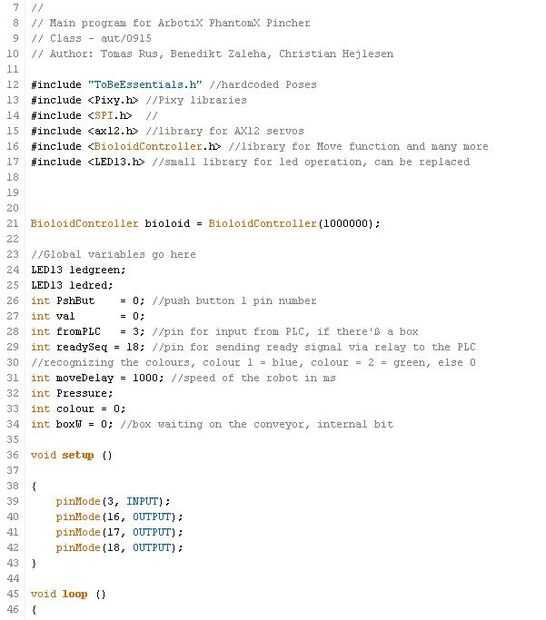 //// ToBeAut_Robotics.cpp // // // Created by Tomas Rus on 01/06/16. // // // Main program for ArbotiX PhantomX Pincher // Class - aut/0915 // Author: Tomas Rus, Benedikt Zaleha, Christian Hejlesen#include "ToBeEssentials.h" //hardcoded Poses #include //Pixy libraries #include // #include //library for AX12 servos #include //library for Move function and many more #include //small library for led operation, can be replacedBioloidController bioloid = BioloidController(1000000);//Global variables go here LED13 ledgreen; LED13 ledred; int PshBut = 0; //push button 1 pin number int val = 0; int fromPLC = 3; //pin for input from PLC, if there'ß a box int readySeq = 18; //pin for sending ready signal via relay to the PLC //recognizing the colours, colour 1 = blue, colour = 2 = green, else 0 int moveDelay = 1000; //speed of the robot in ms int Pressure; int colour = 0; int boxW = 0; //box waiting on the conveyor, internal bitvoid setup (){ pinMode(3, INPUT); pinMode(16, OUTPUT); pinMode(17, OUTPUT); pinMode(18, OUTPUT); }void loop () { delay(1000); Move(homepose); ledred.off(17); ledgreen.on(16); //signalizing ready status with green led boxW = 0; boxW = digitalRead(fromPLC); delay(1000); if (boxW) { ledgreen.off(16); //signalizing operation status with red led ledred.on(17); playSequence(); } } // void loop end void Move(prog_uint16_t* Inn) //inherited from bioloid library { delay(moveDelay); // recommended pause bioloid.loadPose(Inn); // load the pose from FLASH, into the nextPose buffer bioloid.readPose(); // read in current servo positions to the curPose buffer delay(moveDelay); bioloid.interpolateSetup(moveDelay); // setup for interpolation from current->next over 1/2 a second while(bioloid.interpolating > 0) { // do this while we have not reached our new pose bioloid.interpolateStep(); // move servos, if necessary. delay(3); } } void playSequence() { delay(1000); Move(abovecon); delay(1000); Move(xabovecon); /* while (Pressure<500) { //optional use of pressure sensor Pressure = analogRead(26); delay(200); gripper -= 30; if (gripper <0) { gripper = 0; } ax12SetRegister2(5, 30, gripper); } */ delay(1000); Move(undercam); delay(1000); colour = getColor(); switch (colour) { case '1': //moving boxes to the first pile Move(pile1); delay(1000); Move(xpile1); delay(1000); break; case '2': //moving boxes to he second pile Move(pile2); delay(1000); Move(xpile2); delay(1000); break; default: //moving unrecognized boxes to the dump pile Move(dump); delay(1000); Move(xdump); break; } Move(homepose); }int getColor() { Pixy pixy; pixy.init(); delay(500); int blocks; int j; int i = 0; int color = 0; while (color != 1 || color != 2) { blocks = pixy.getBlocks(); if (blocks) { i++; // do this (print) every 20 frames because printing every // frame would bog down the Arduino if (i%20==0) { Serial.println(color); color = pixy.blocks[j].signature; return color; } } } }