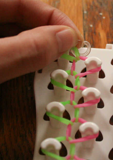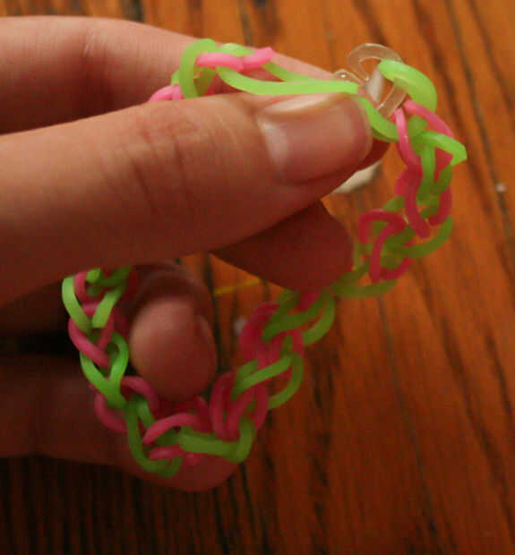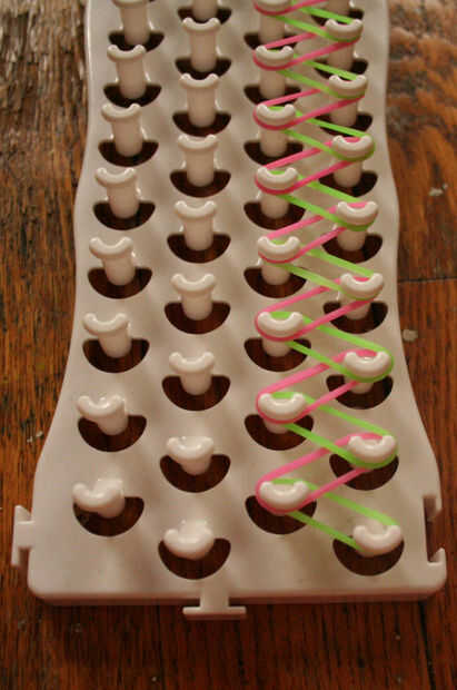 Para las bandas de goma de color, puede utilizar dos colores o usar una combinación de tres o más colores. En mi ejemplo, estoy usando bandas de goma verdes y rosas.
