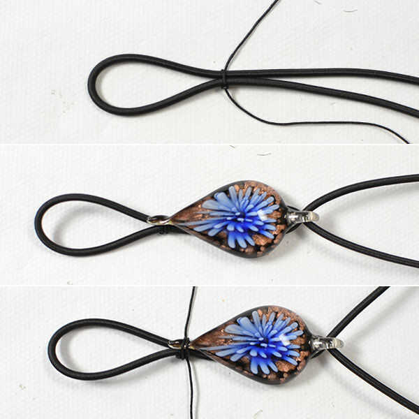 2 º, entre el elástico de la secuencia a través del orificio de la perla murano y atar el otro extremo firmemente a la cuerda elástica.