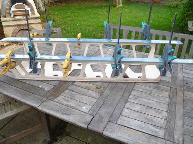 Unte pegamento de contacto en ambos los esquís y los carriles de la pista de trineo. Esperar 10 minutos (o cualquiera que sea el fabricante del pegamento dice) hasta que el pegamento es de contacto seco. Cuidadosamente las superficies de contacto y luego fije con abrazaderas por unas horas.