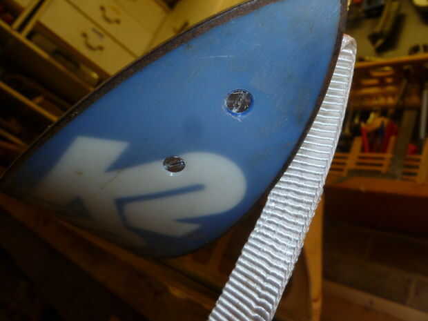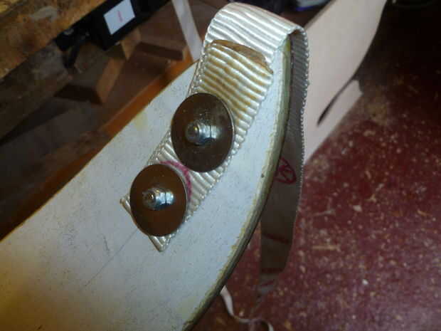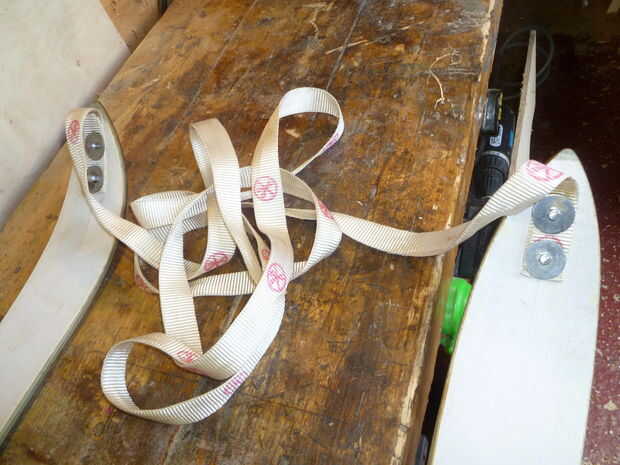 Coloque la cinta - doblada una vez - con tornillos de cabeza avellanada y las arandelas grandes para cada esquí. Los agujeros en la superficie de los esquíes de la hendidura para que no sobresalga la avellana. Calentar un destornillador con un soplete y utilícelo para hacer agujeros en la cinta, alineada con los orificios de tornillo. Esto evitará cualquier desgaste. Por la misma razón, sellar extremos cortados de la cinta con un soplete.