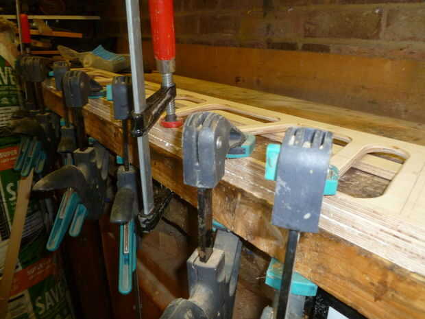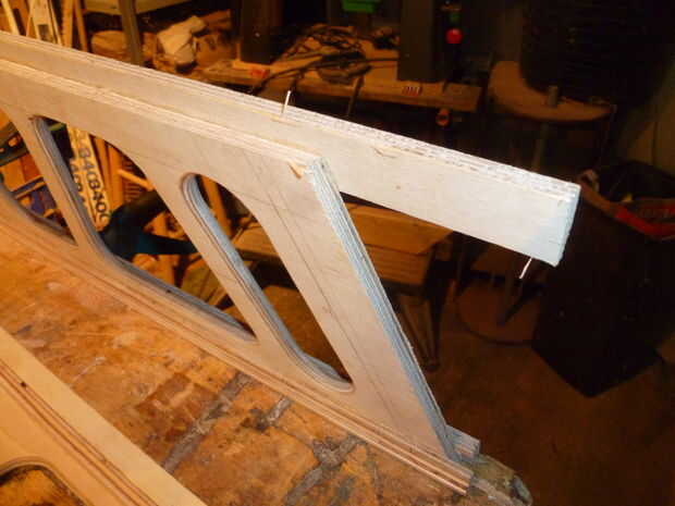 Cola para madera uso PVA o similar para pegar a dos largueros en la parte inferior de cada panel lateral para que tenga una superficie de adherencia de madera contrachapada de triple ancho para los esquís. Este agrandamiento de superficie es importante ya que el marco de la madera contrachapada es realmente contacto pegado a los esquís - más sobre esto más adelante. Pegue el larguero en la parte superior de cada panel lateral para que cree un reembolso por el panel superior en. Recuerda que en ambos casos para observar el ángulo de 15 grados.