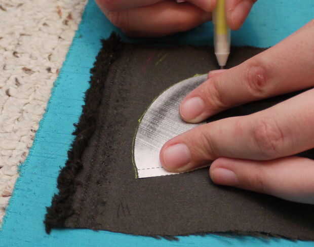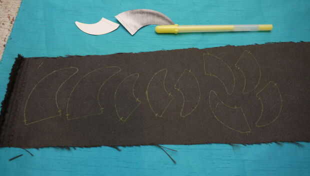 Trazar los lados curvos de los patrones (es decir, las líneas discontinuas en el pdf) en el lado menos agradable de la tela (el lado que desee dentro de los cuernos). Haga dos copias de la espina dorsal grande y y seis del pequeño (aunque usted puede hacer algunos repuestos mientras estás en él) en una mitad de la tela de tal manera que usted será capaz de doblar la otra mitad de la tela debajo y coser por ambos. Se utilizó una pluma de gel de color claro de seguimiento.