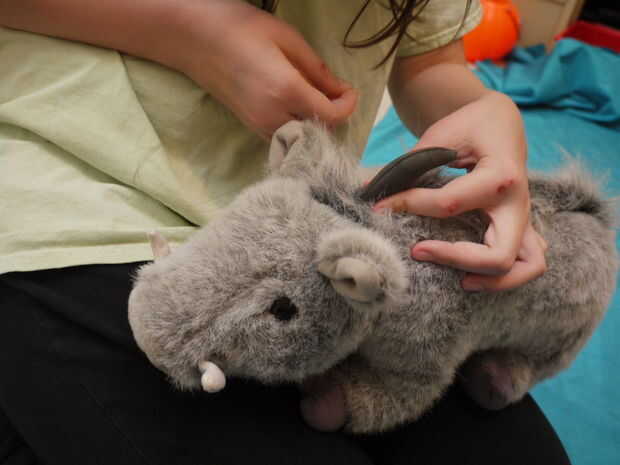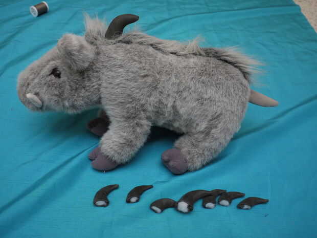 Colocar los cuernos en la parte trasera del patrón: grande, pequeño, pequeños, pequeño, grande, pequeño, pequeño, pequeño. El primer grande es alrededor de los hombros. El segundo es justo pasado donde el warthog pone su trasero más amplio.