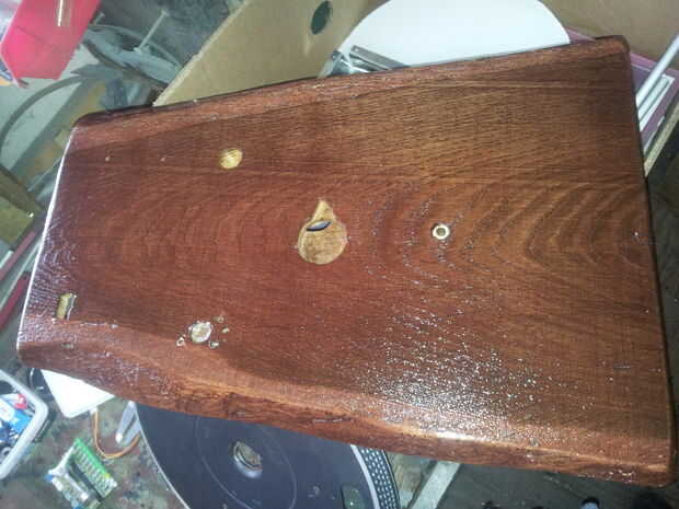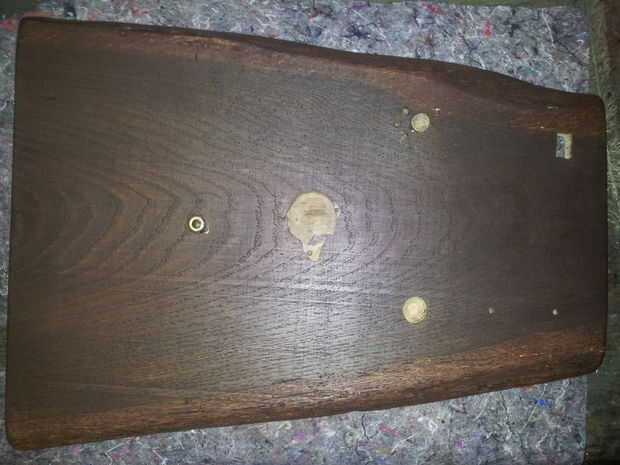El roble es un material muy bonito, incluso si no está manchada. Quiero mi placa un poco más oscuro y un poco más brillante, así que decidí trabajar en eso. Barnizar la madera es también necesario, porque la madera conserva su corteza y esta parte es mucho más sensible y estaba totalmente perforada por gusano de madera.
