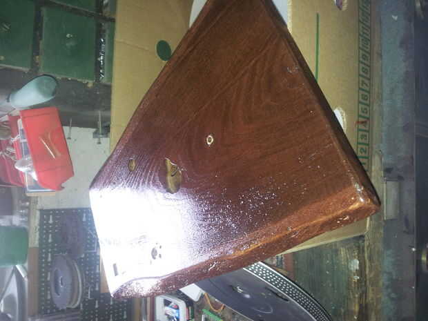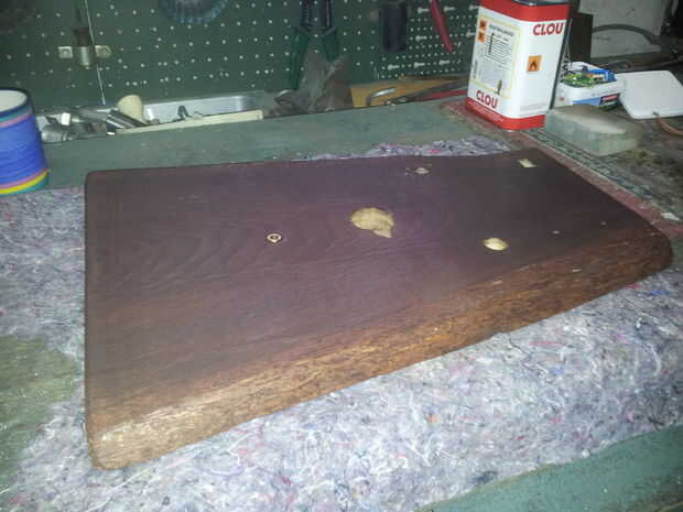 Lija la placa entera en ambos lados con diferentes papeles hasta que era muy suave. Había manchada con la mancha de color oscurezca y después de un día el tiempo de espera había barnizado con 5 capas de barniz claro.