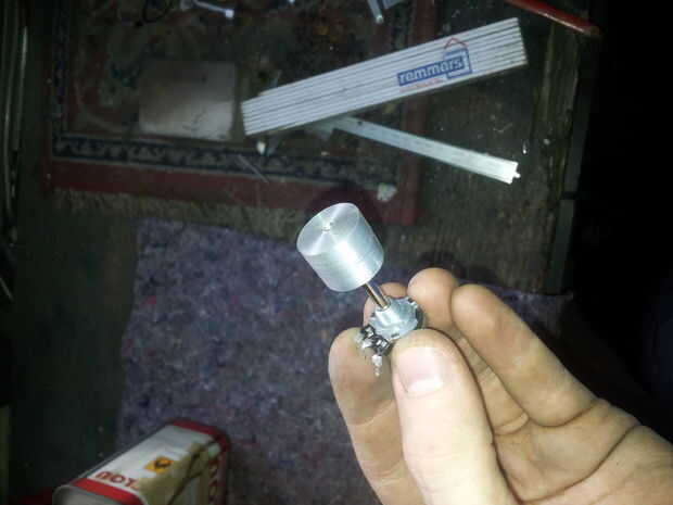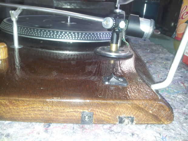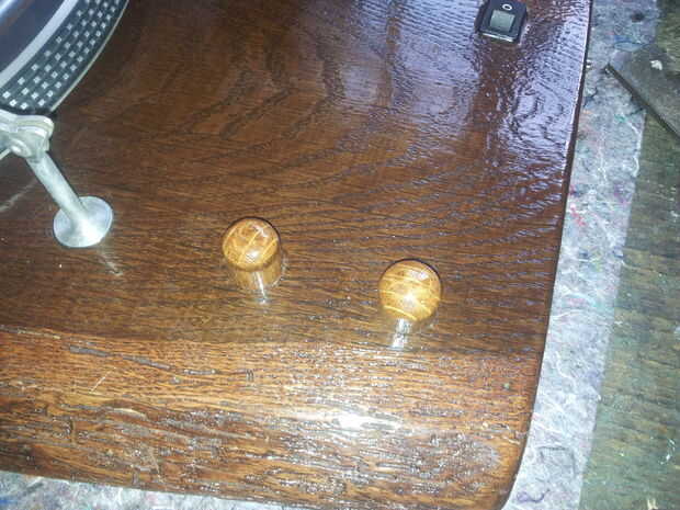 Al principio pensé en hacer algunos en aluminio, pero el resultado no fue el mejor resultado óptico para mí. Después de pensar en el uso de botones de plástico u otros materiales, quedé capturado por alemán roble otra vez. Tomé otro pedazo de madera vieja y comenzó a torno forma redonda fuera de él. Después de un trabajo adicional con un papel de lija, coloración y barnizado, obtuve un resultado muy atractivo. El botón de encendido es de plástico negro y parecía lo suficientemente bueno como para poder construir. La fuente de alimentación y conectores de salida de sonido se colocan en la parte inferior derecha en los agujeros de montaje.