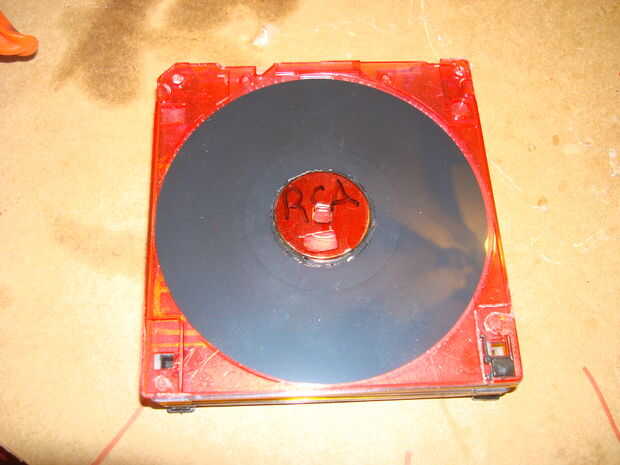 Pegamento cada disco sobre la base de los tocadiscos, alternando los colores. Que utilizará 5 disco lleno para el disco de la caja y 1/2 para la plataforma de registro, esta pieza debe tener el topetón. El perro en el centro del disco de 1/2 de pegamento.