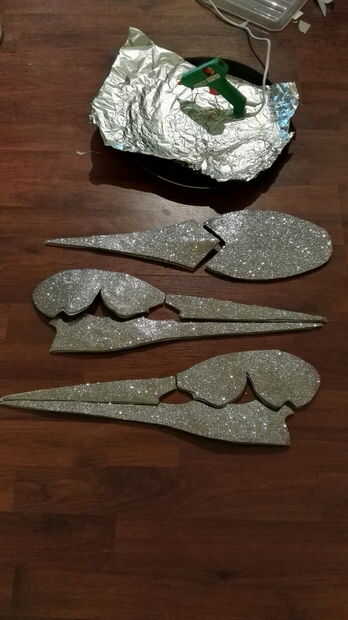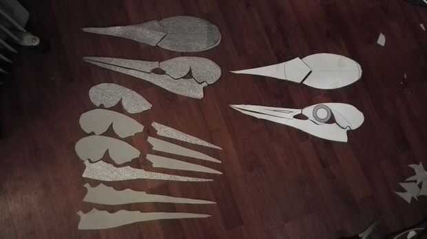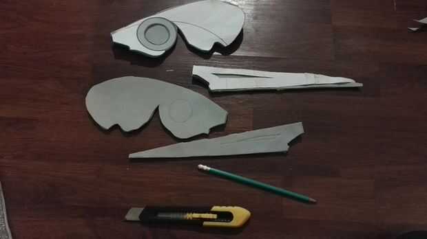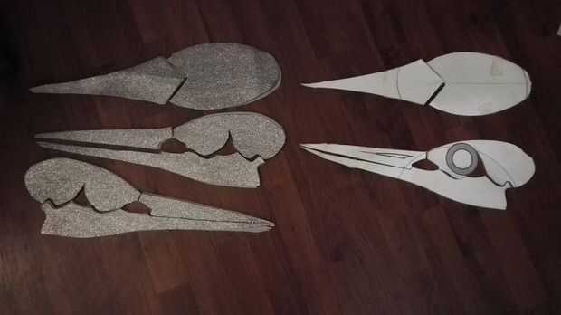 De los patrones, trazar y cortar piezas de espuma. Me caliente pegan varias capas de espuma para dar la rigidez mayor tocado. Yo también en forma de las piezas del cráneo caliente pegué He redondeado a los lados del cráneo y forma un pliegue en la parte superior del pico. El número de capas necesarias para cada sección es los siguientes: