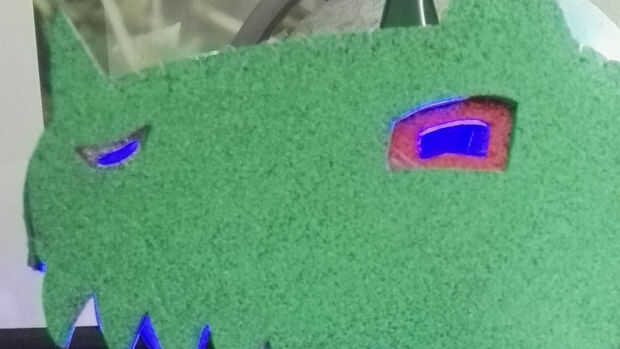 Si planea agregar luces de filamento dentro de su cabeza de dragón a los ojos y fosas nasales de luz de fondo, necesita hacer recortes en los ojos y la nariz para que las luces que brillan a través de (ver segunda foto). Usé un cuchillo y cortar éstos hacia fuera a mano alzada, básicamente traza contornos más pequeñas de las formas de ojo/nariz externa.