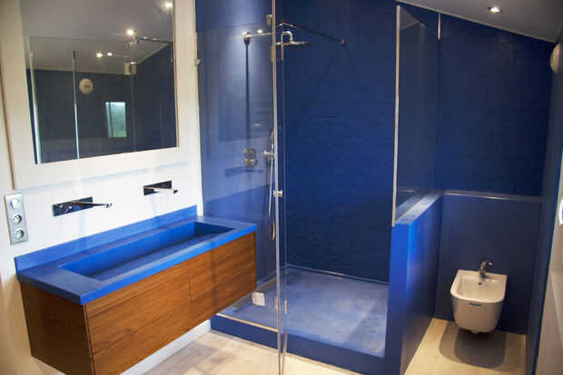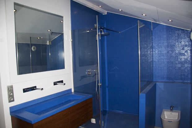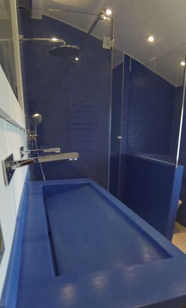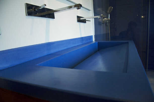 GFRC panels, vanity, bowl, for this blue bathroom.