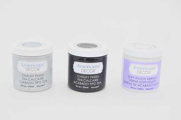 Usé tres productos de la decoración Americana para pintura y barniz. (ver en la foto). Usé 2 frascos de 8oz Carbon(Black) cretáceos acabado pintura y un tarro de antaño calcáreo acabado pintura y barniz de tacto suave para el acabado final.