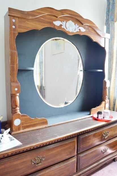Limpiar los muebles enteros (es decir tocador) y limpiarla para quitar la suciedad y el polvo. Cualquier área donde no desea que la pintura de la máscara. En mi caso, cubrí los bordes del espejo. Inicio pintura sección por sección. Primero cubrí la parte interior de la mesa (es decir, en el espejo).