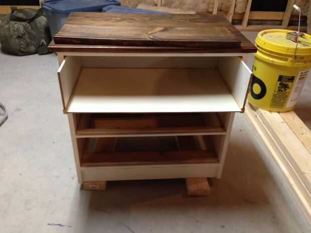 Mi esposa me ayudó y había pintado de blanco las partes originales. Entonces atornillado en la tapa nueva. Tiñe la parte superior y paneles frontales con un nogal de Minwax la mancha y aplicación unas cuantas capas de poliuretano.
