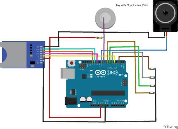 Conecte el circuito como se muestra en la figura. Ahora aplique desnuda color conductor en el material plástico del juguete. En este proyecto hemos aplicado en la palma derecha de Mickey Mouse. Conecte el alambre fino con el área de la pintura conductora aplicada a arduino Uno Pin 8 como se muestra en el circuito. Agregar biblioteca "tmrpcm" para el IDE de Arduino.