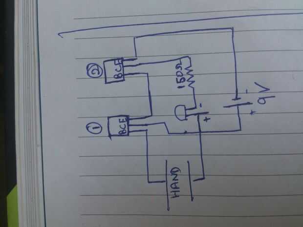 Ahora, vamos a echar un vistazo en el diagrama del circuito. He utilizado dos TIP 31. Aquí estamos haciendo uso del transistor como interruptor. Tan pronto como toque la terminal base y positivo de la batería con su piel una muy pequeña corriente fluye a través de la piel en la base del transistor debido a la alta resistencia de la piel. Esta pequeñísima corriente de base pone el transistor en "modo ON" y LED se ilumina.