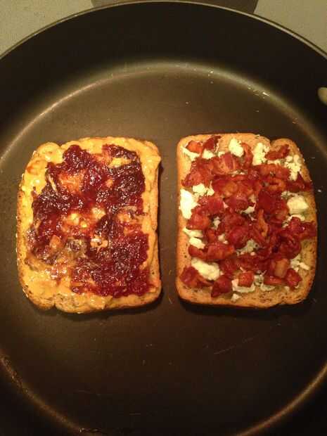 Se observe la mantequilla de maní y preservar parte de ablandamiento y convertirse en líquida. El queso azul se convertirá en suave pero no se derrita. Cocinar hasta que comience a conseguir una buena corteza y color dorado en su tostada.