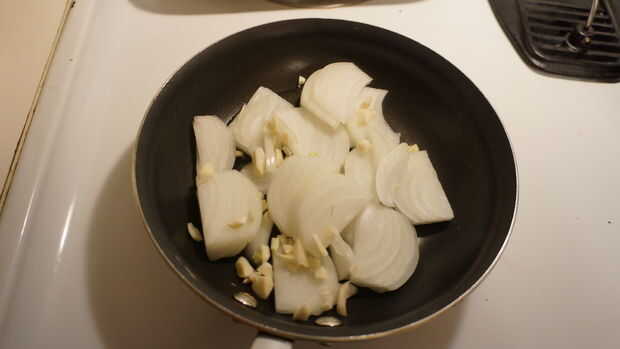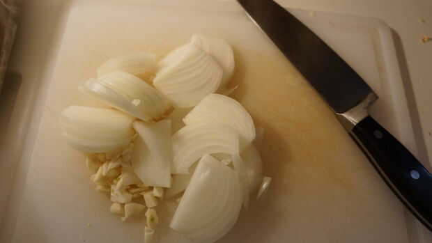Empezaremos con cortar la cebolla y el ajo, luego les echar en la sartén más pequeña con un toque de aceite de oliva. Ajuste la hornilla en sobre medio por ahora debe ser bueno. Revuelva en consecuencia.