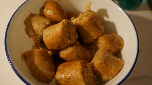 A continuación vamos a tomar el boudin y corte en 1 1/2" a 2" pedazos y colóquela en un recipiente. (Boudin es típicamente ya cocida.)