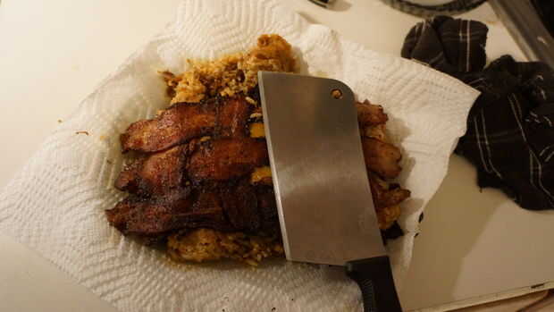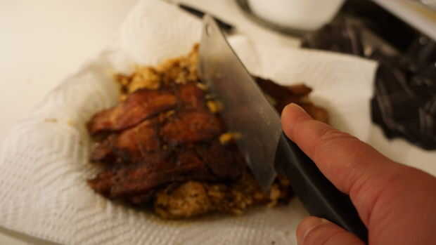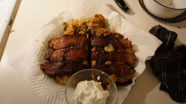 Tal vez agregando un bateador y luz empanado para el tocino, después el tocino está cocido hará una mejor carcasa independiente.