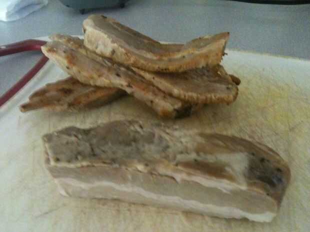 Al final de la semana tomar el tocino hacia fuera, enjuague la cura y pat el tocino seco. Ahora puede ser al horno o ahumado a una temperatura interna de 71° C (160° F). Cuando el tocino esté fuera del horno o fumador quitar la piel de cerdo y guardarlo. Es tan bueno en la sopa. Que el tocino fresco, corte para arriba y utilice como lo haría cualquier otro tocino!