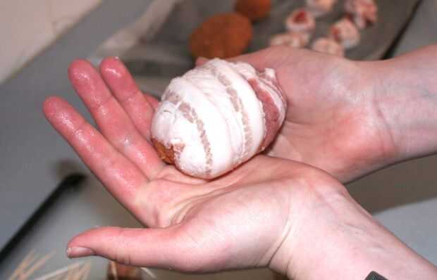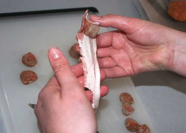 Después se envuelve el cuerpo del cerdo, utilice el pulgar para presionar una chuleta para que la cabeza puede descansar allí.